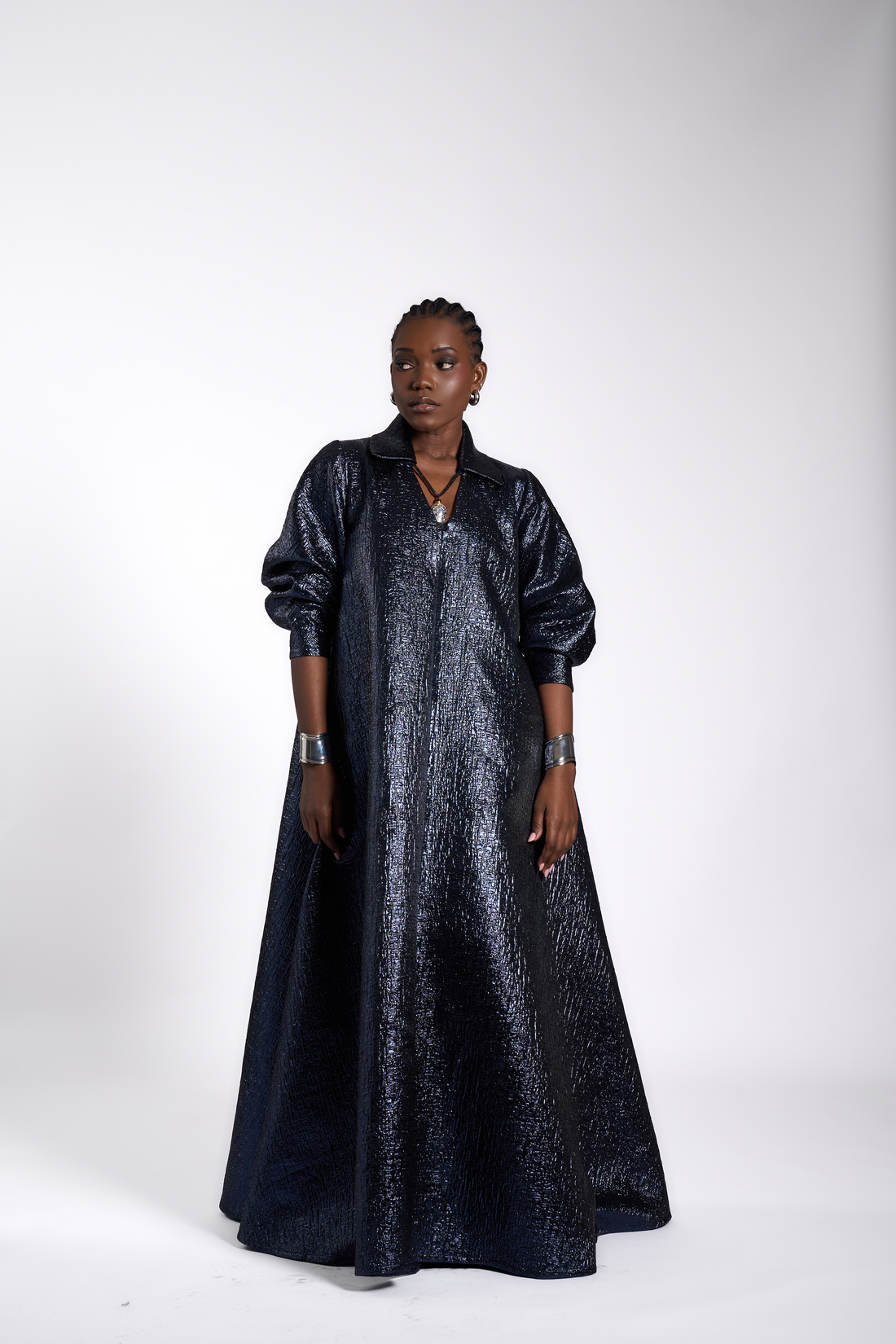 Midnight blue shimmering metallic kaftan features a flowing, comfortable cut. The design includes a stylish...