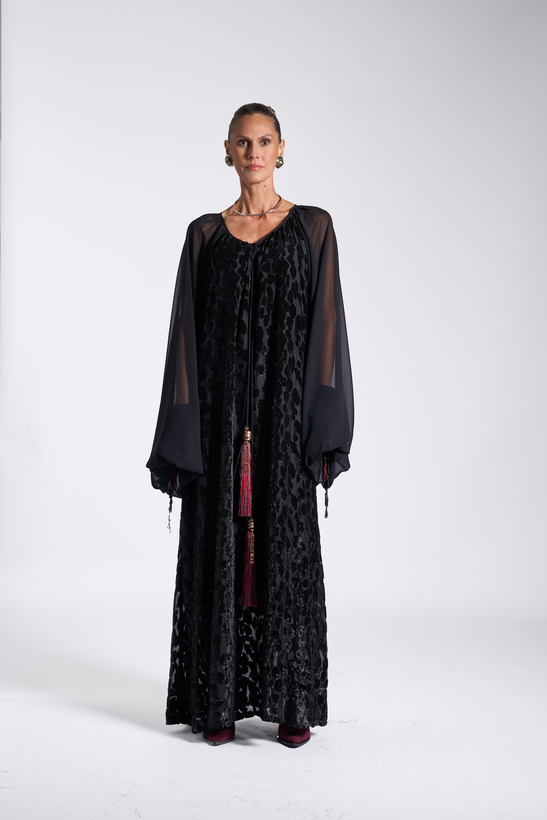 Floor-length kaftan crafted from a sheer black fabric adorned with an intricate metallic floral pattern...