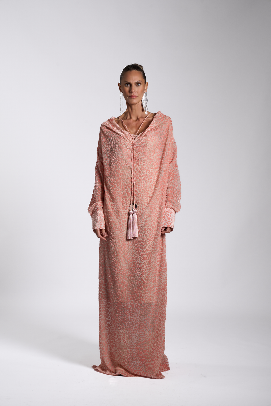 Floor-length kaftan defined by a relaxed, voluminous cut with a draped neckline and elegant buttoned...