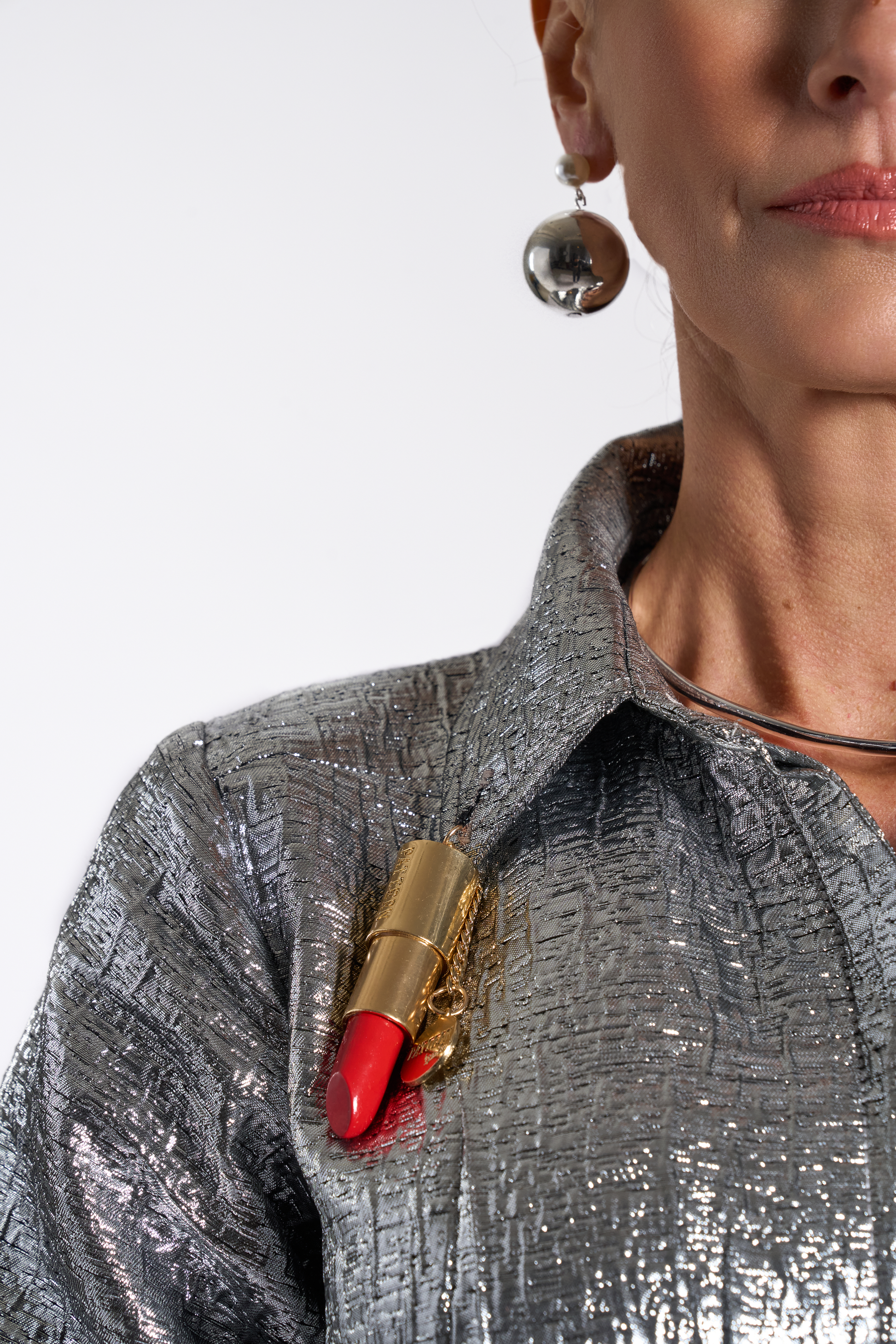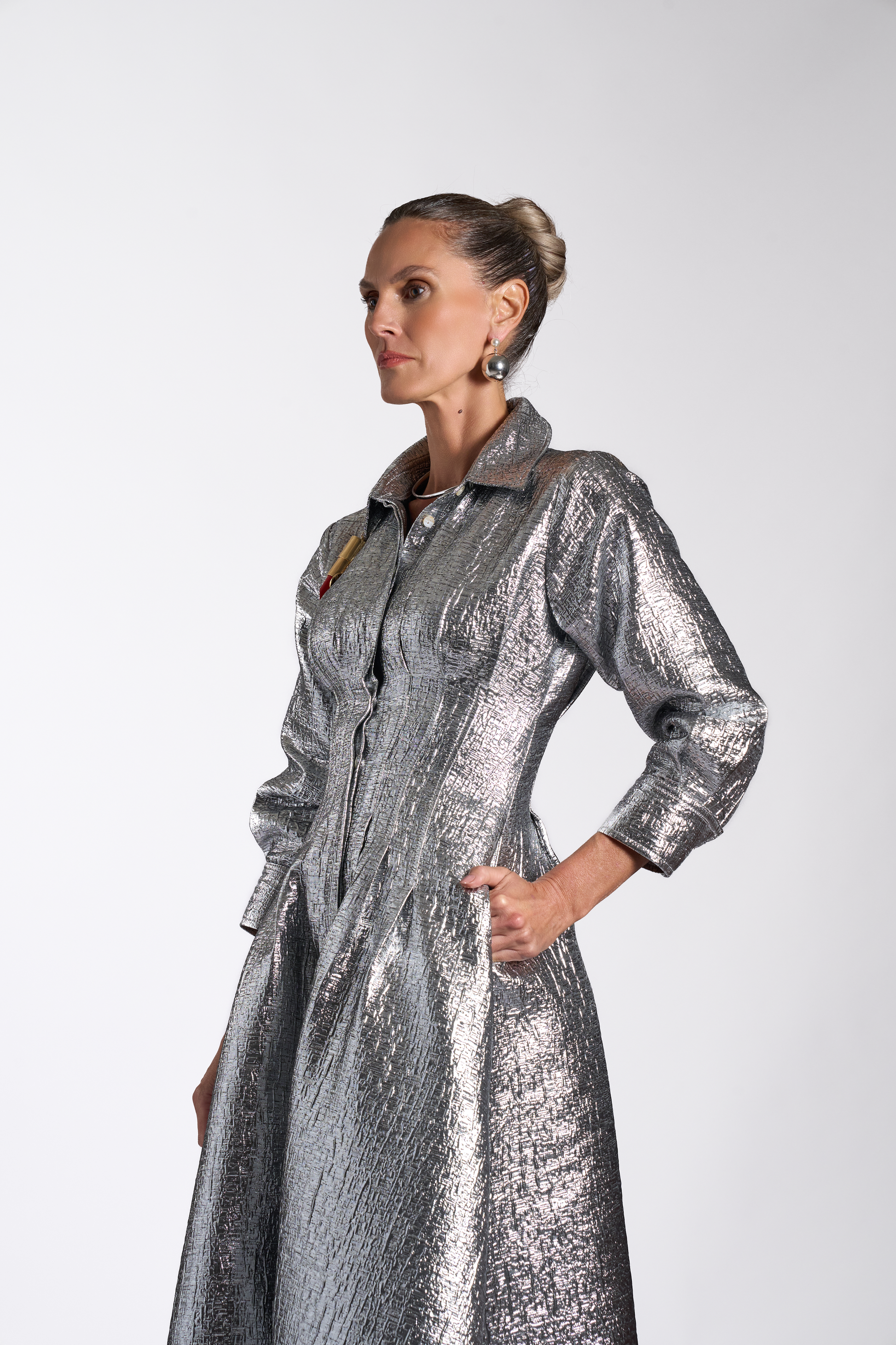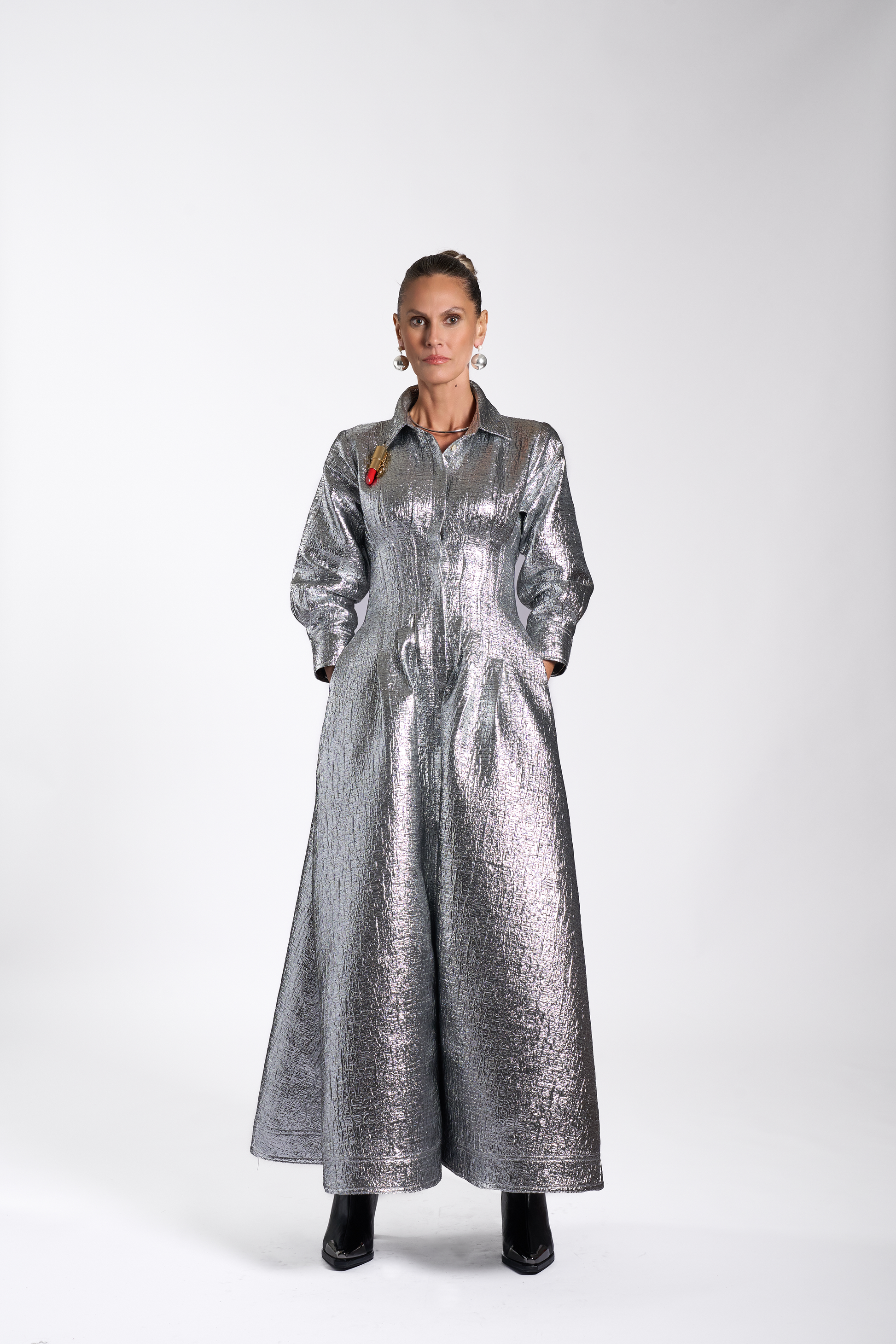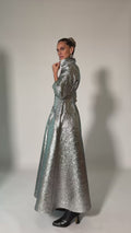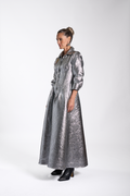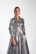 Crafted from silver textured metallic fabric, featuring a structured waist cut that creates a defined, elegant silhouette. Designed with a classic collar adorned with customized Pattern By Wadha lipstick charm and three-quarter length sleeves for a refined look.