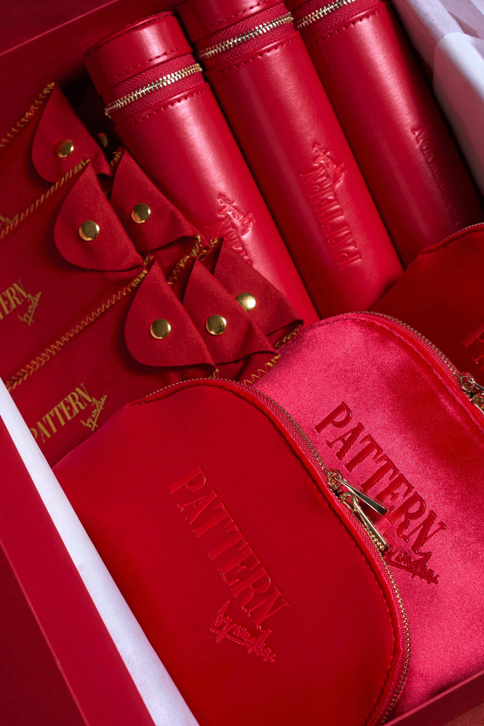 Pattern By Wadha bundle elevated your beauty routine with this exclusive, all in one curated collection. Designed with a sophisticated red and gold aesthetic, this bundle combines essential tools with elegant storage solutions. What’s includes: