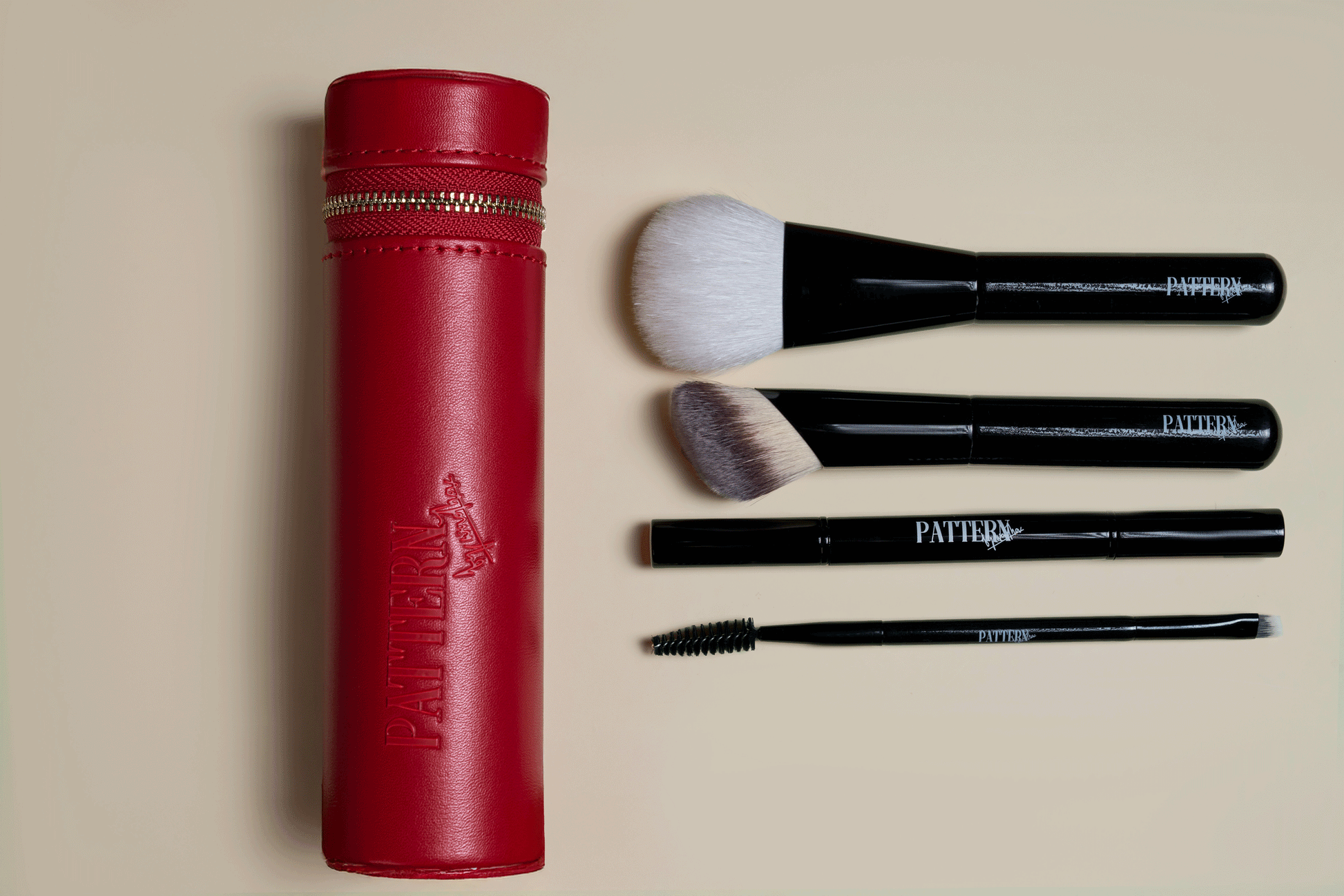 The brushes are housed in a red leather case finished with a branded 3D logo and a gold zipper with a logo puller, offering both protection and understated elegance.