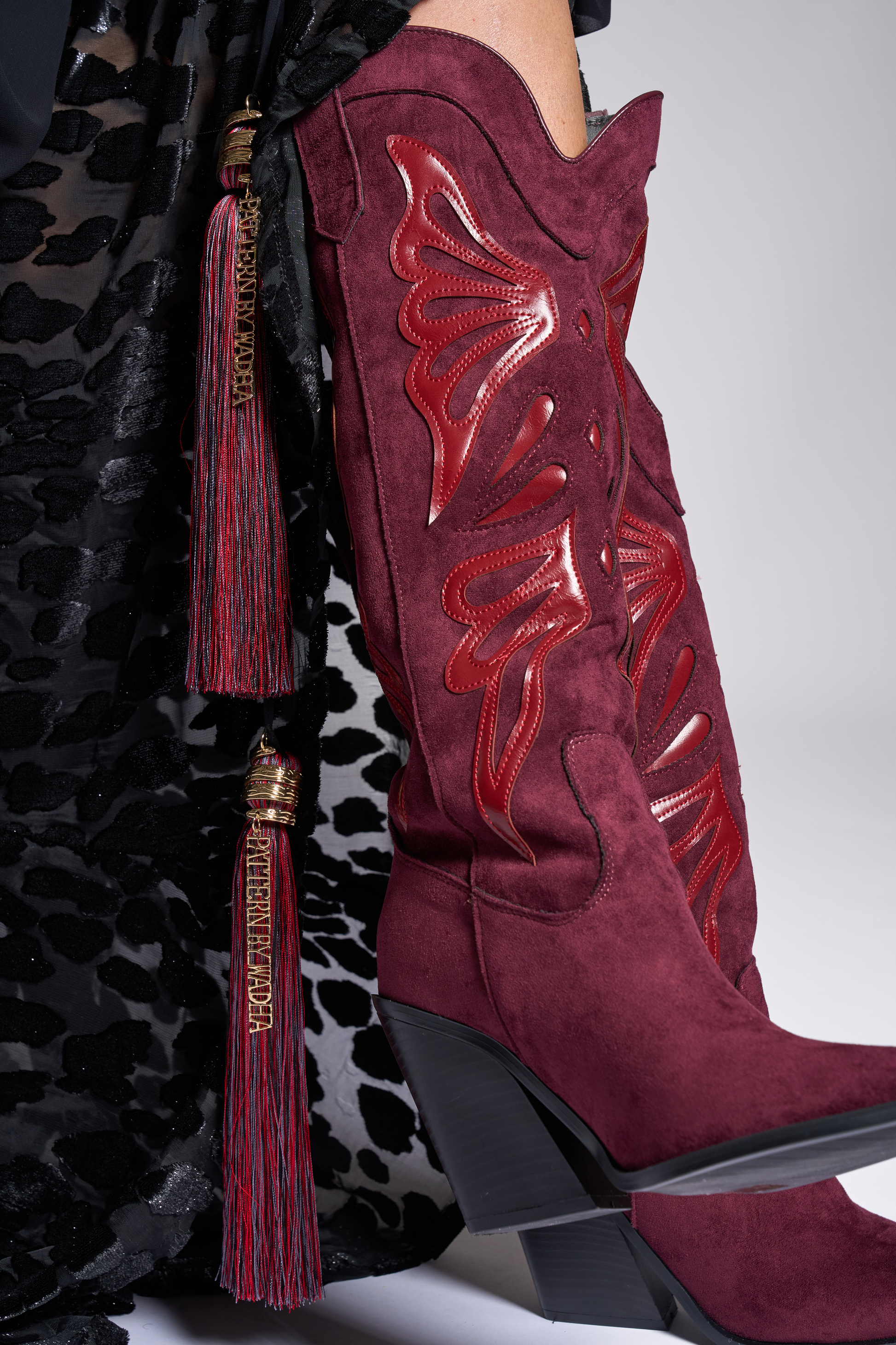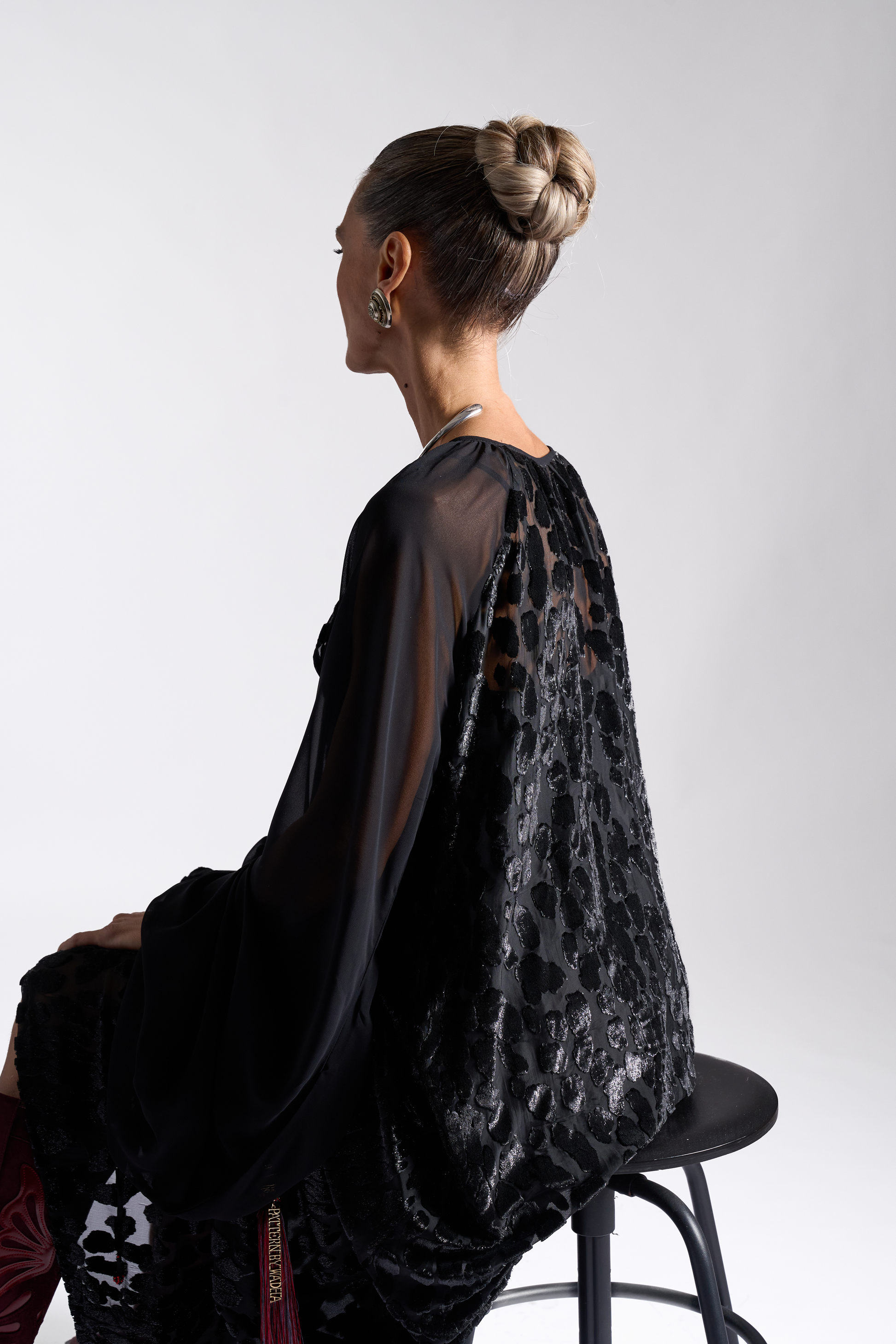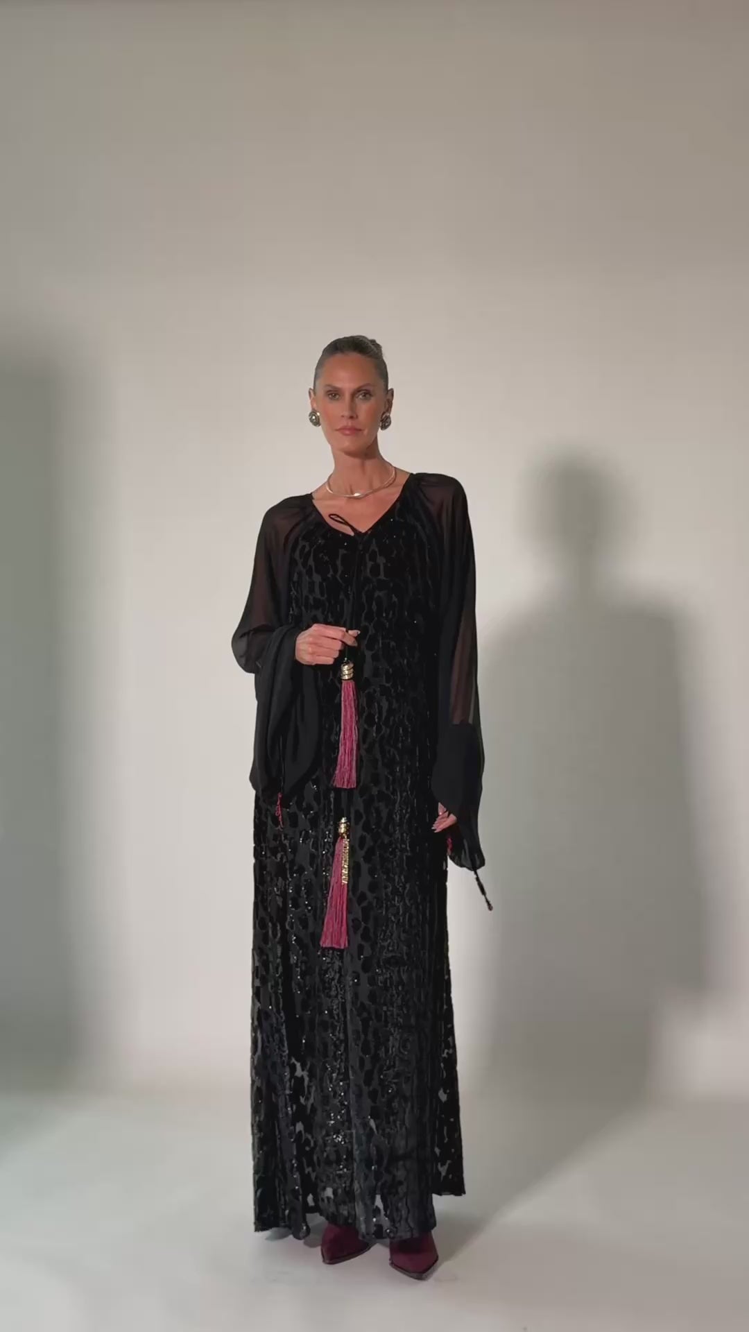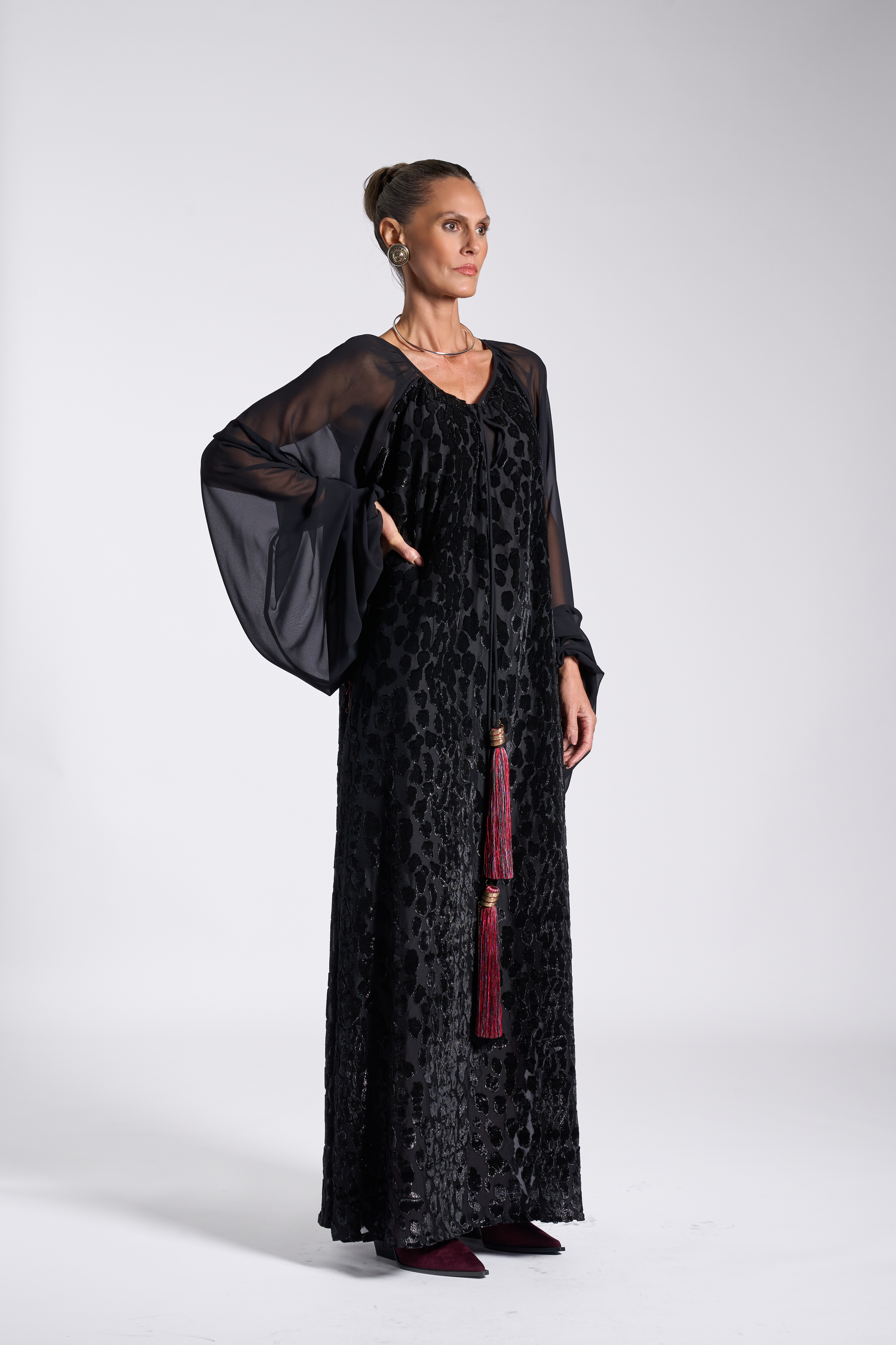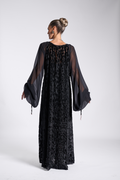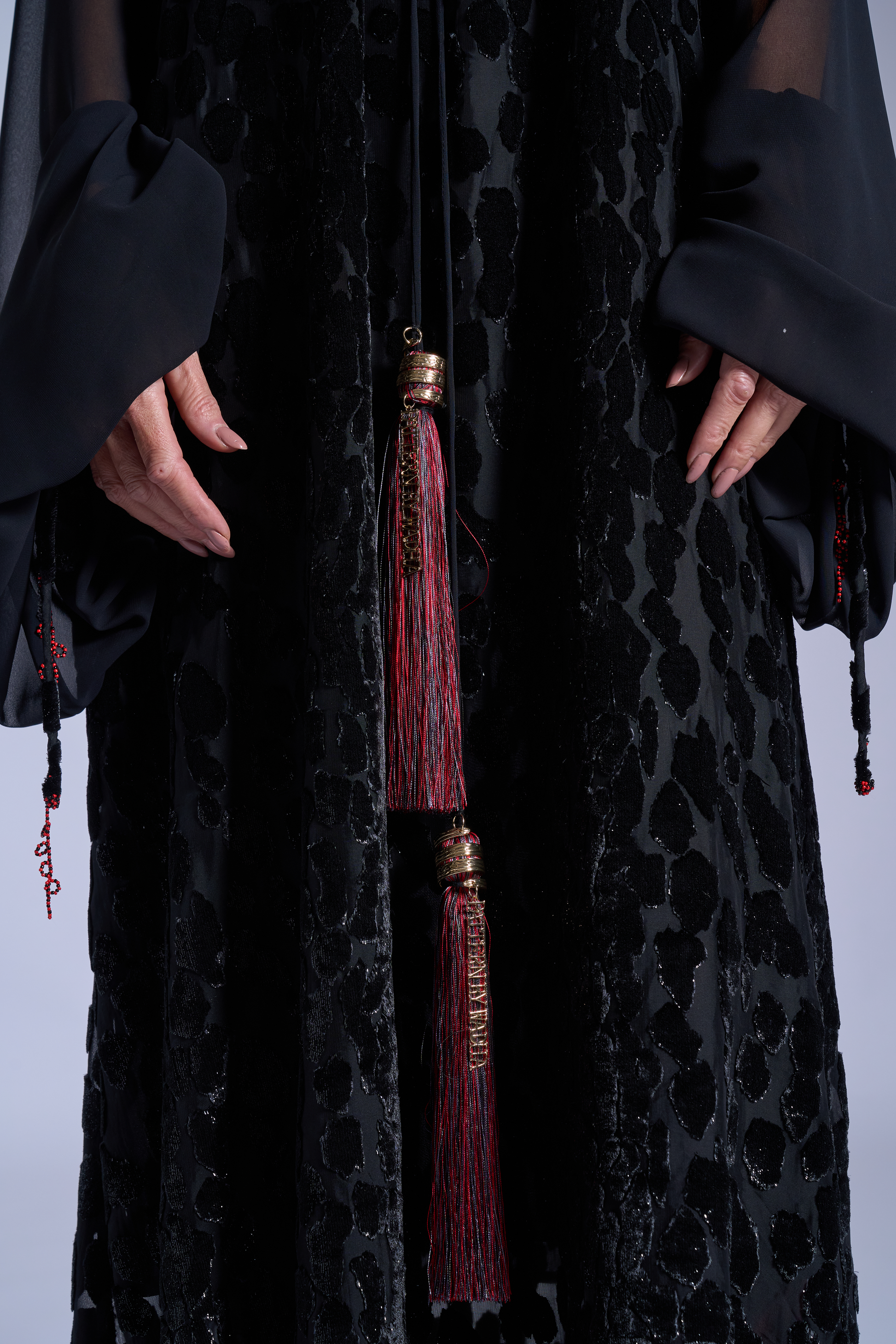Black floor-length kaftan with voluminous sheer sleeves and a luxurious burnout velvet animal pattern. Centered by a long necktie detailed with ornate gold hardware. Finishing the look a bold, bi-color silk tassels in red and grey with ‘Pattern By Wadha’ customized spiral charm.