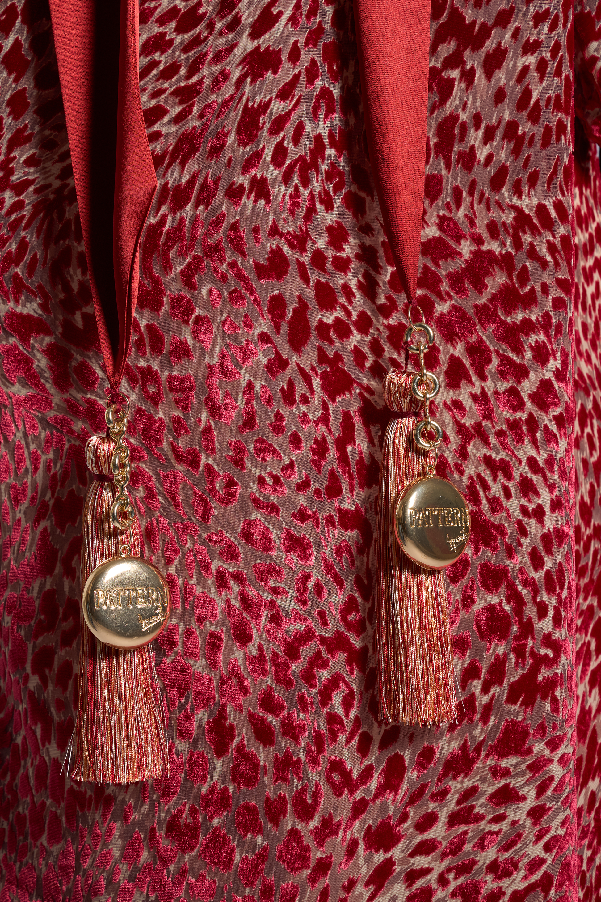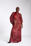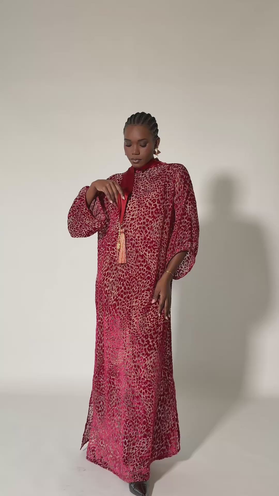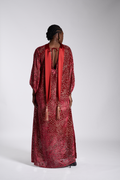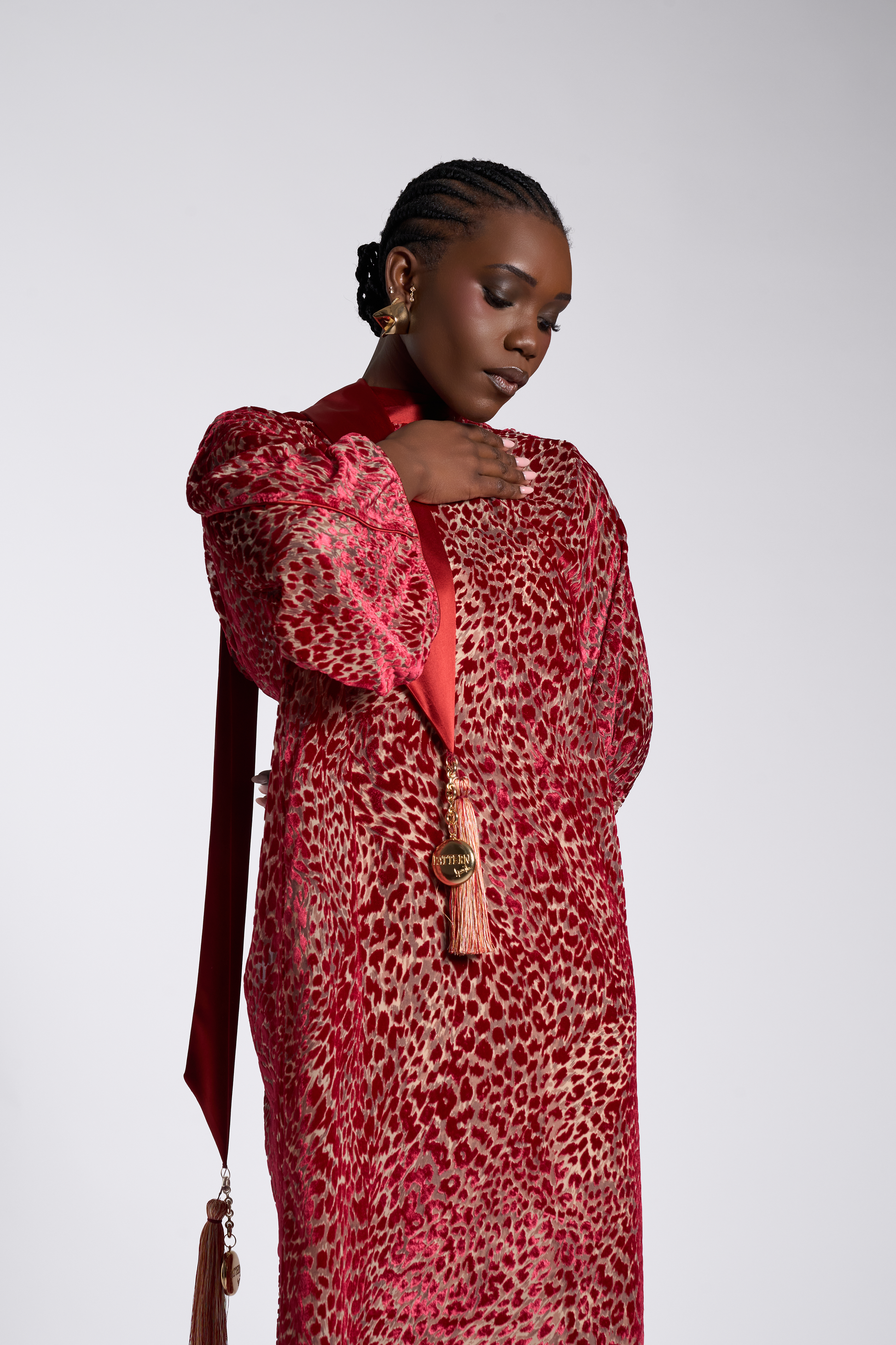 Relaxed floor-length silhouette kaftan crafted from a rich red burnout velvet with a bold animal-inspired pattern. The design is elevated by a sleek satin high collar and matching neckties, which are finished with statement gold "Patten By Wadha" charms and silk tassels.