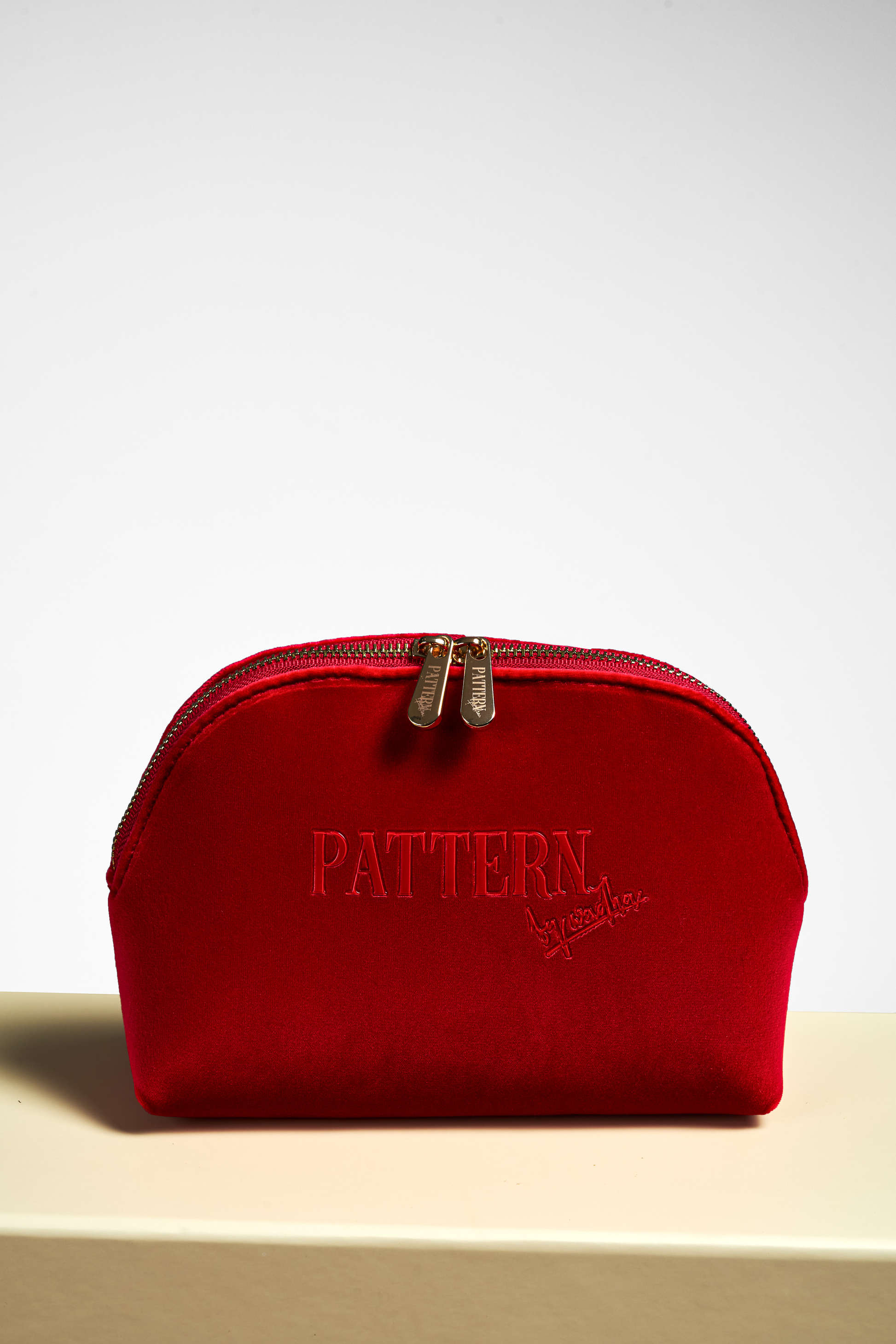 A deep red velvet pouch defined with rich texture and elegant presence. The 3D Logo adds a bold, tactile signature. Finished with gold zipper a branded puller. Compact and perfect companion for storing beauty essentials with effortless sophistication.